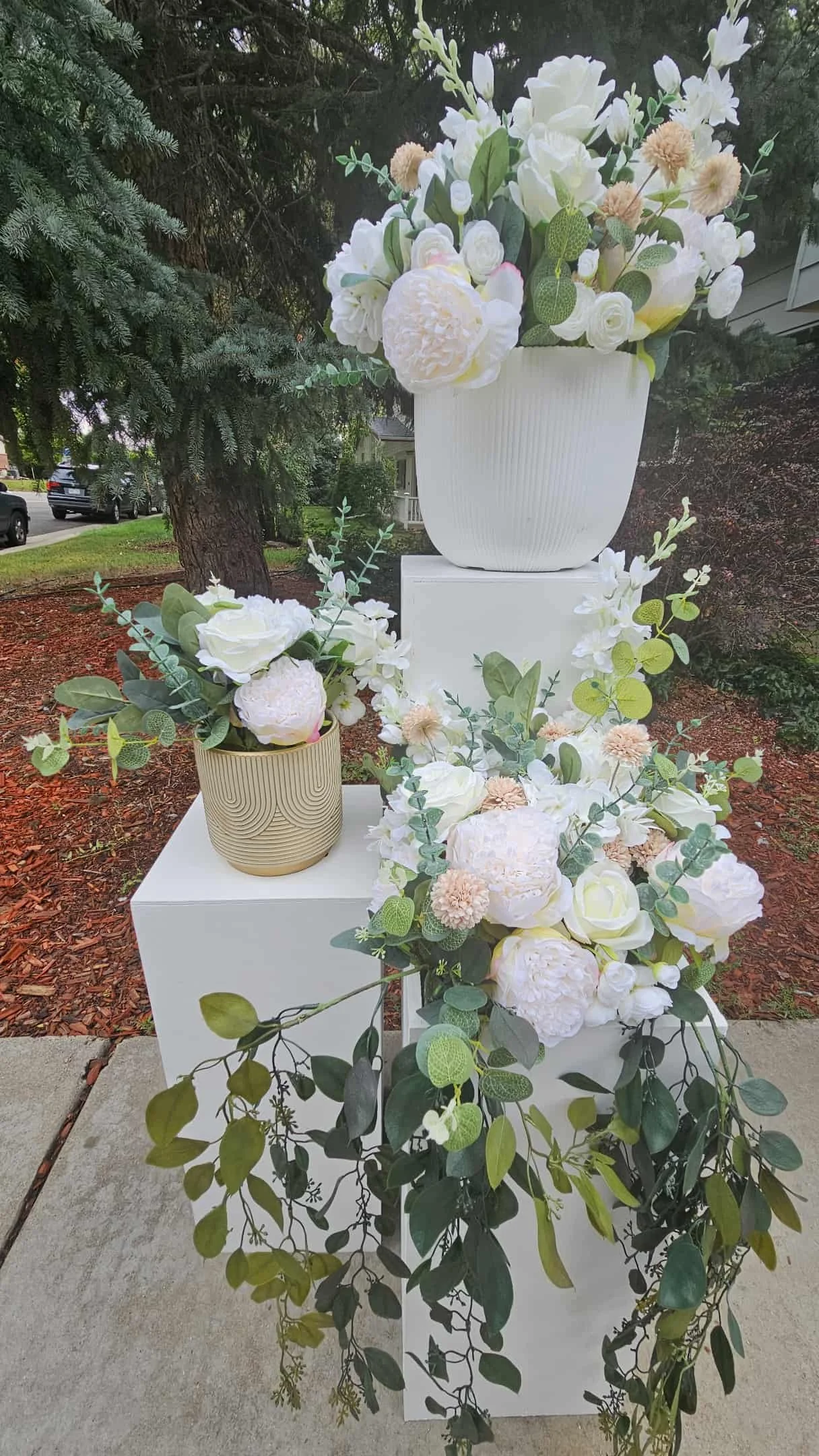 Transform your wedding space in minutes with our elegant white pedestal floral set — perfect for framing your ceremony, aisle, or sweetheart table. Each set includes eight sleek white pedestals styled with lush, neutral florals that complement any color palette. Four of the flowers are able to be moved, while two of the pedestals have the flowers permanently added.