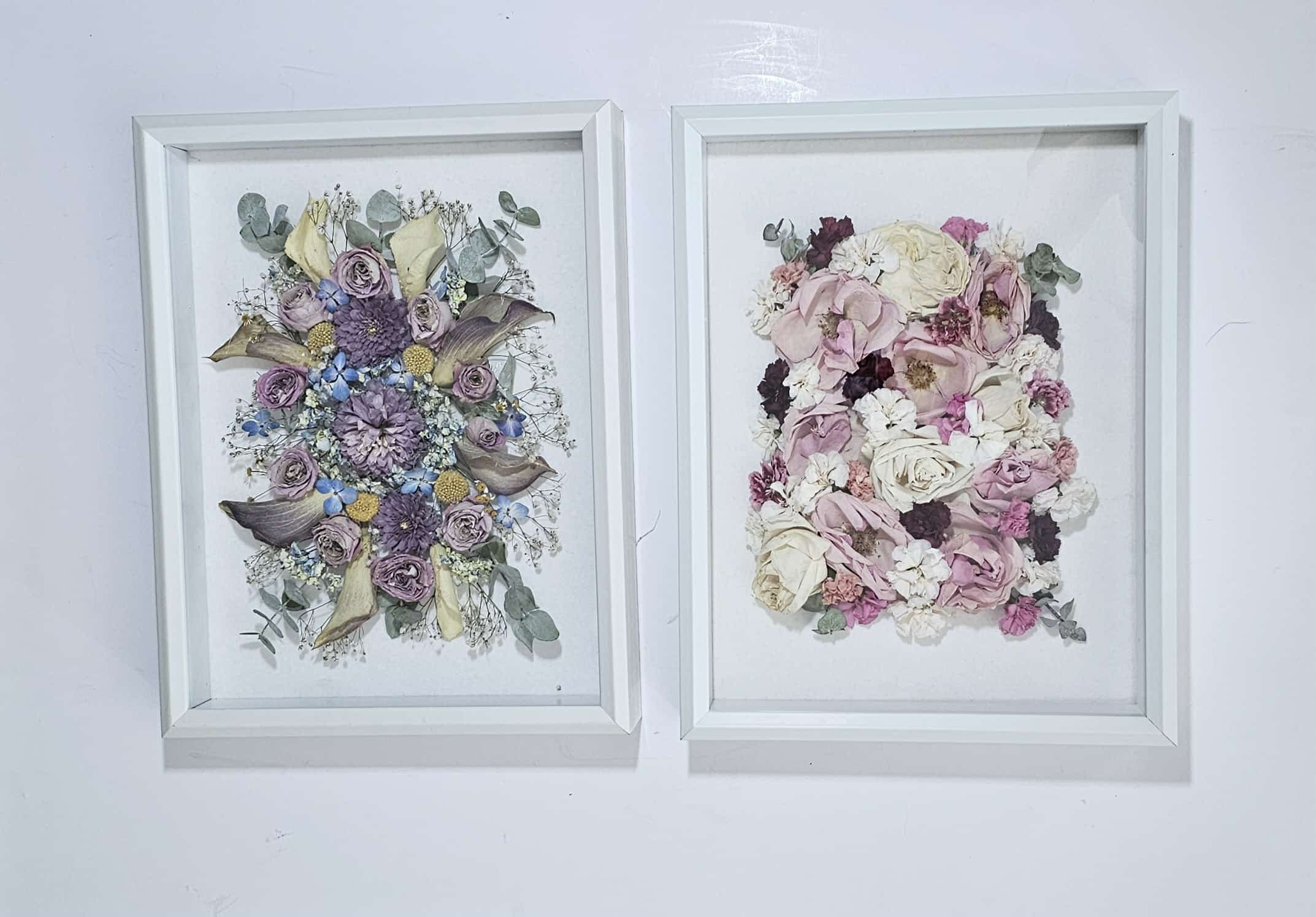 Shadow boxes are the perfect option if you love a full, dimensional design. Instead of pressing the flowers flat, they are dried in silica to keep as much texture and shape as possible—beautiful, sculptural, and full of depth.